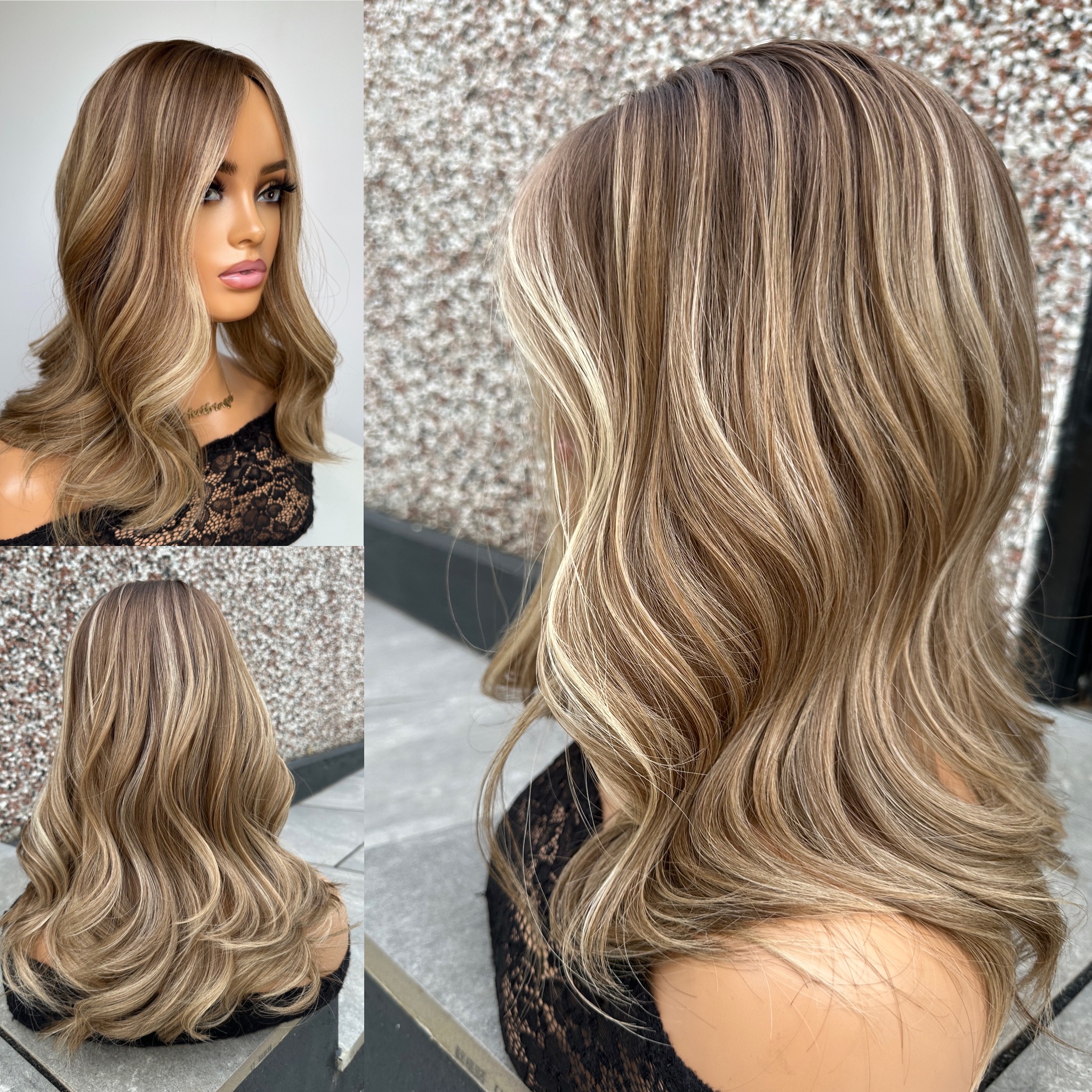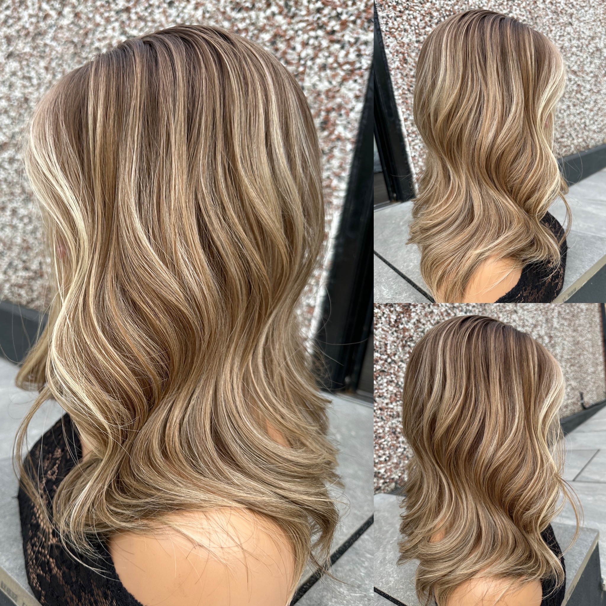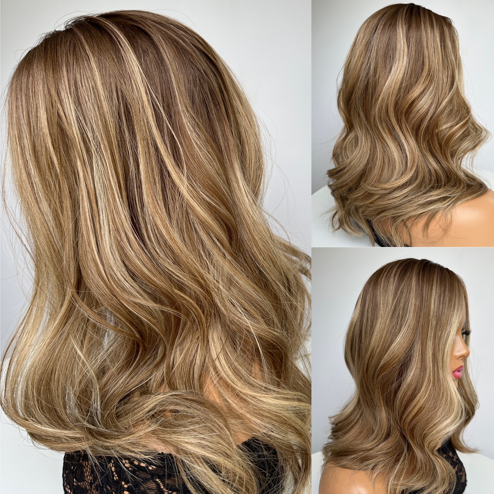 Super dimensional blonde, brown, sun-kiss mix with warm level 6/7 soft root smudge and blonde money piece