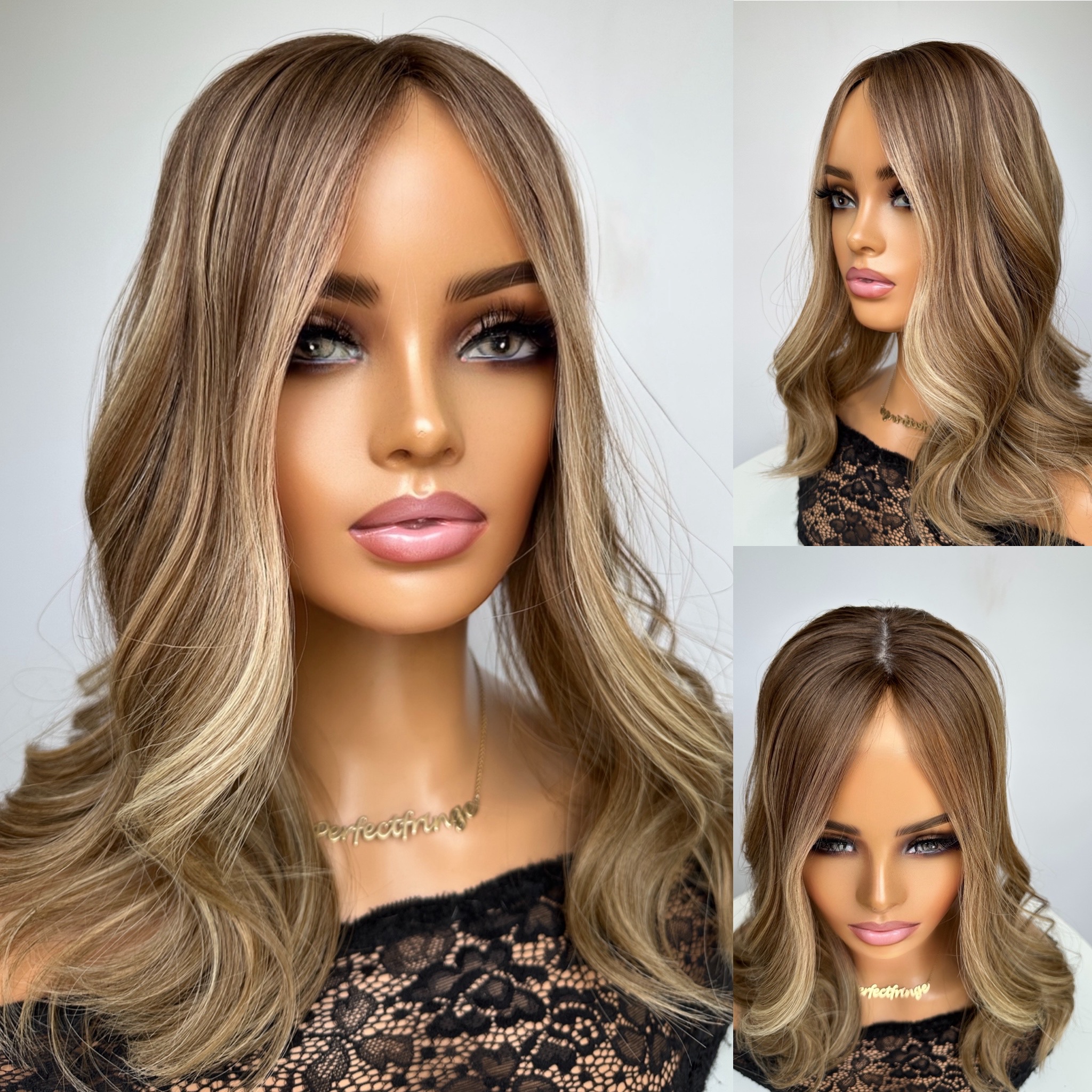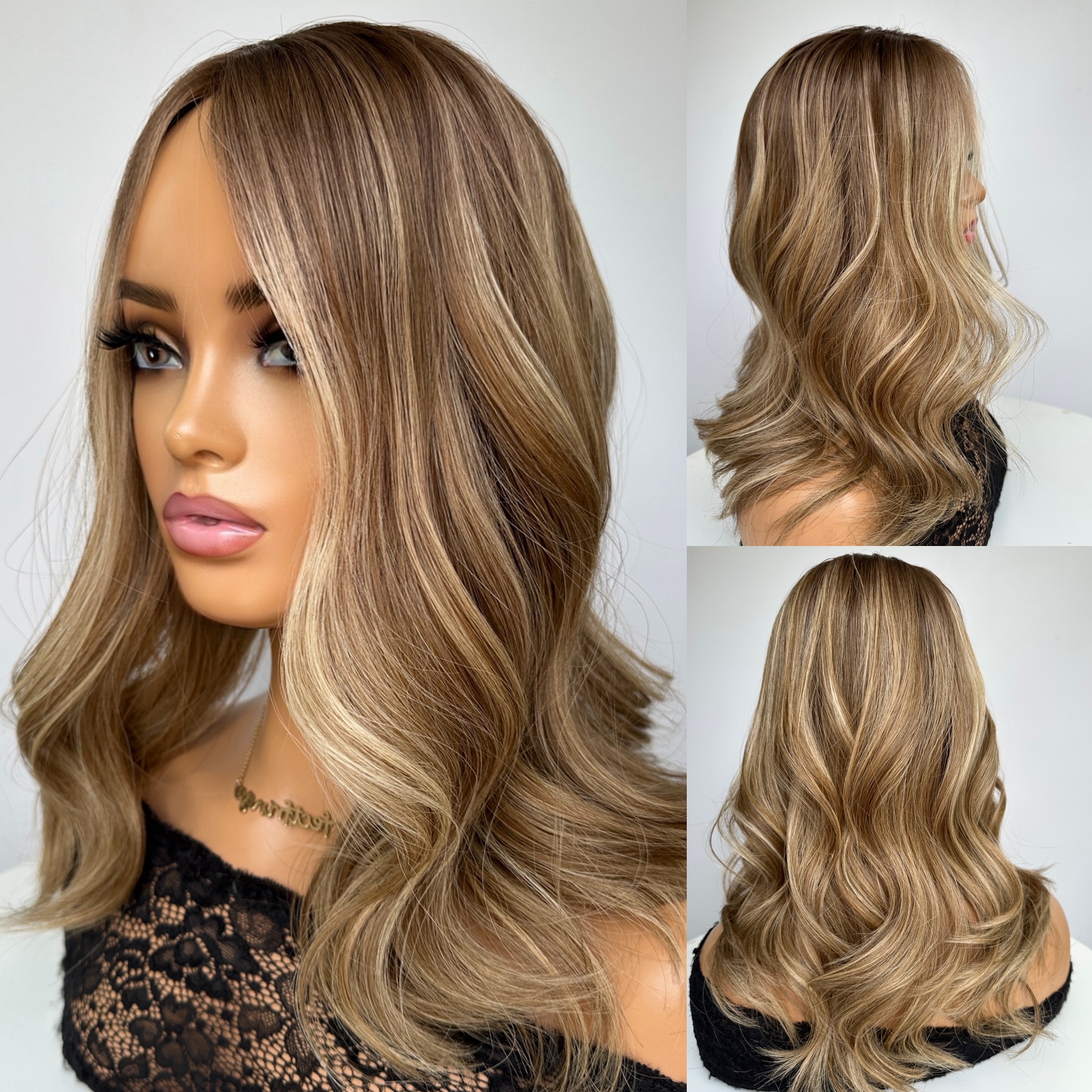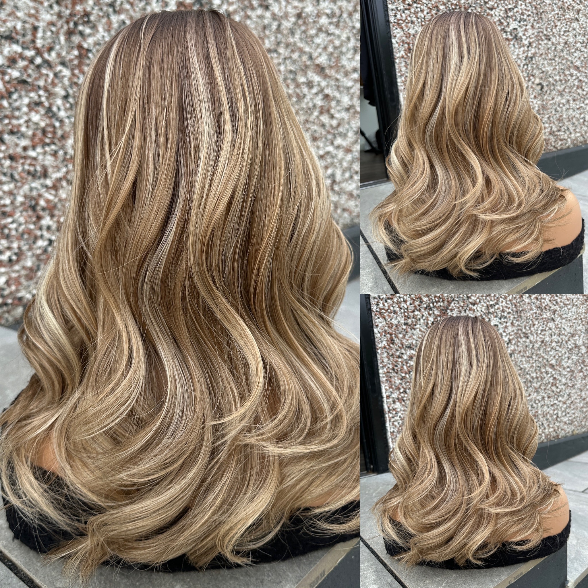 Super dimensional blonde, brown, sun-kiss mix with warm level 6/7 soft root smudge and blonde money piece