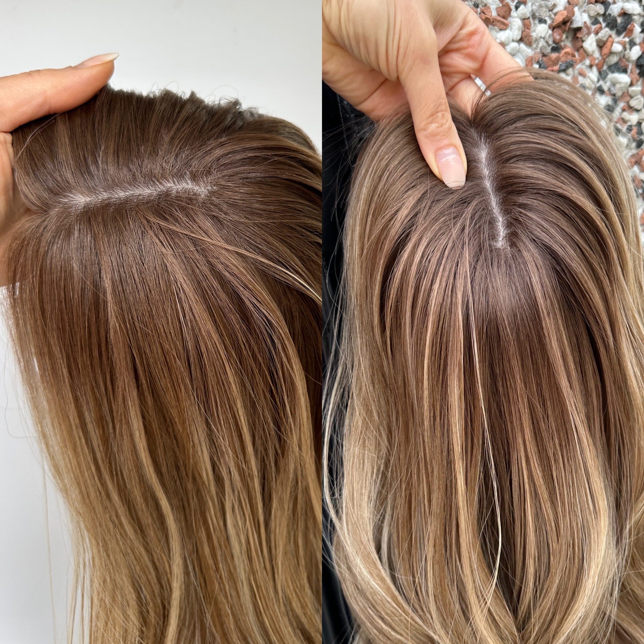 A Luxury Silk Hair Topper which blends beautifully with your own hair to hide hair loss and thinning.  The end result is natural and undetectable.