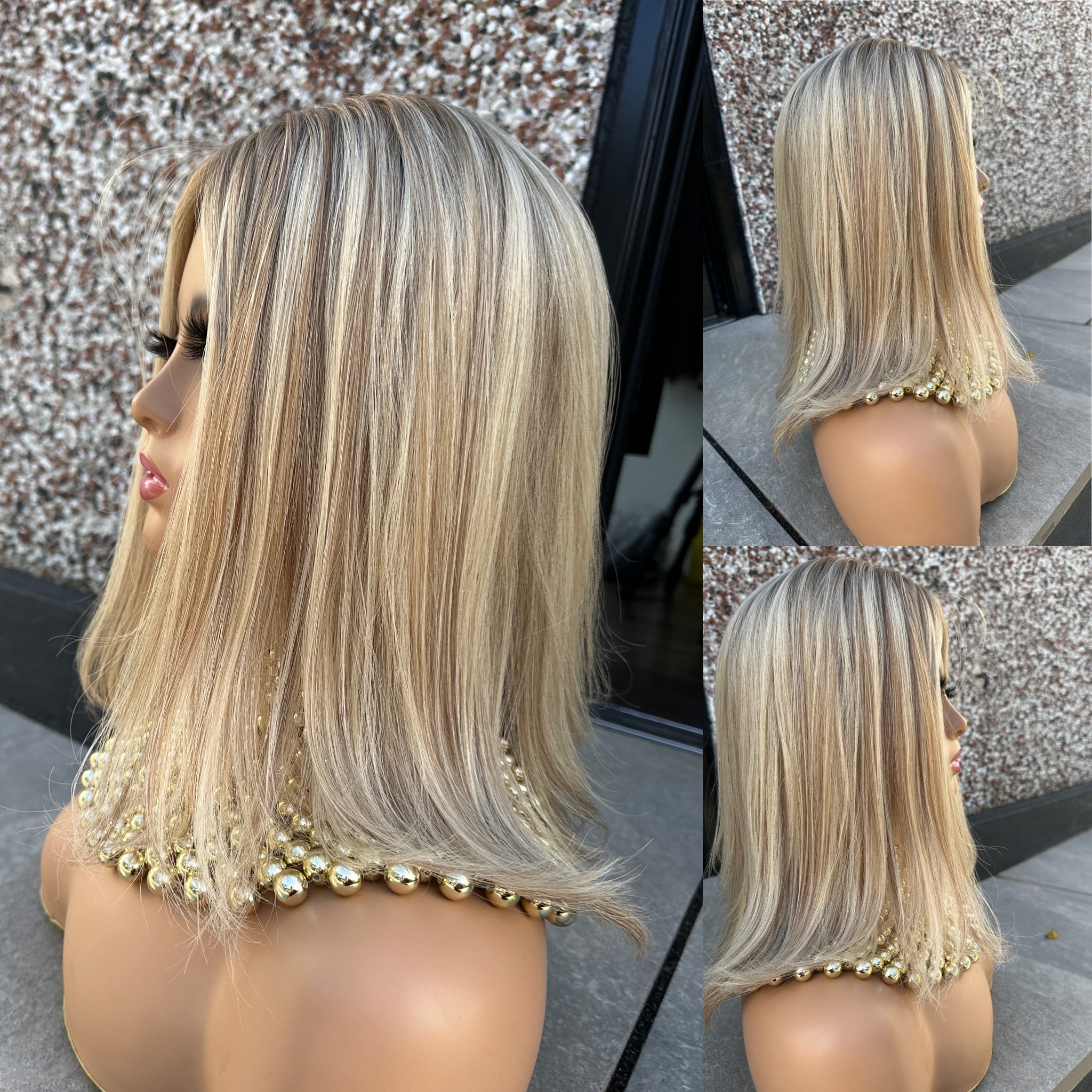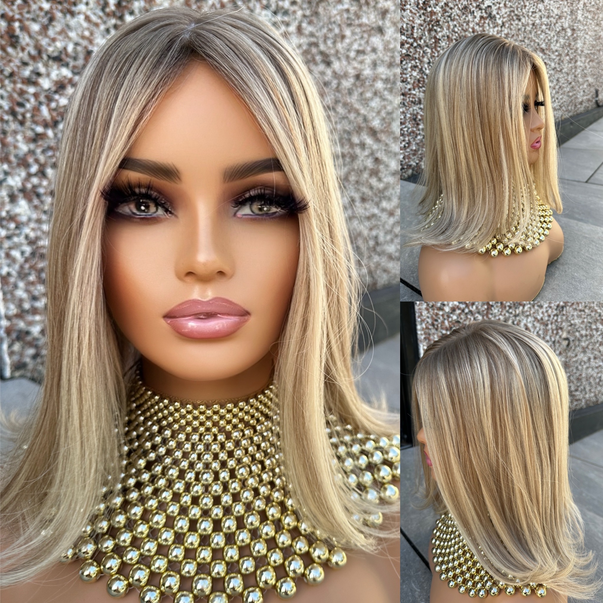 Two tone golden ultra fine mix with short, natural, champagne beige roots