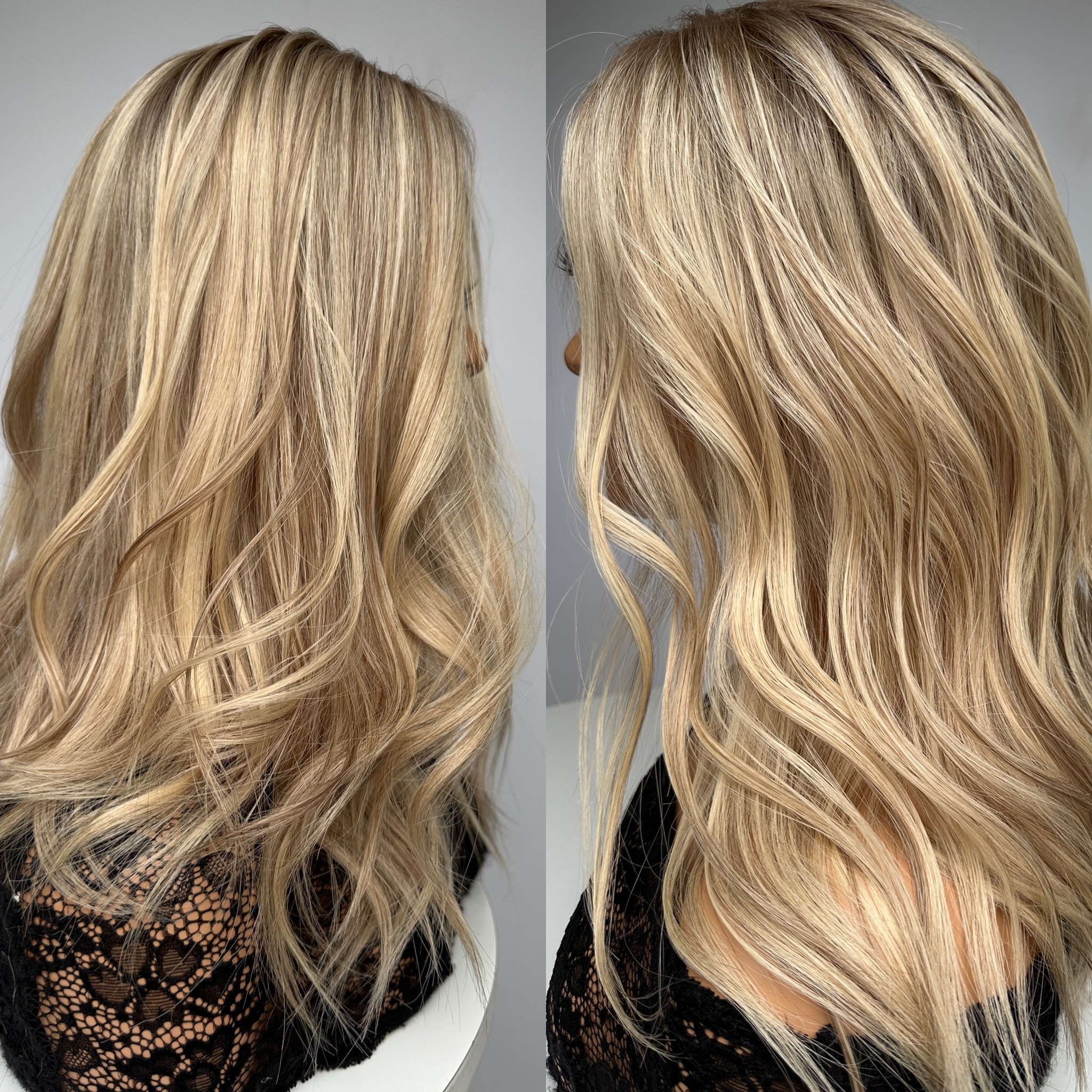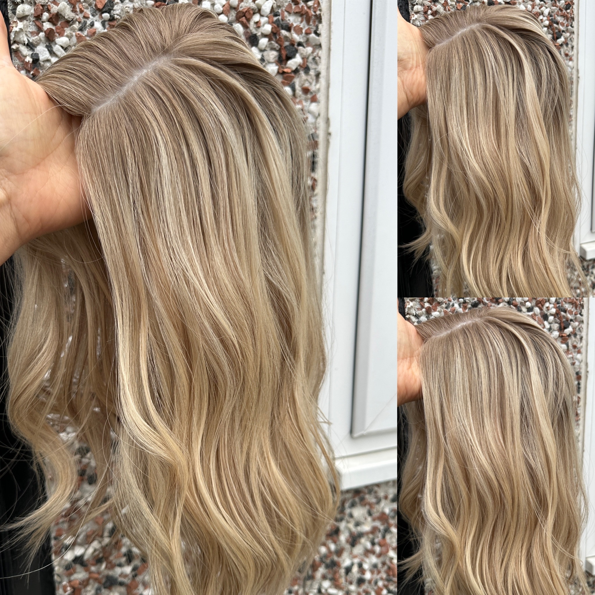 Two tone golden ultra fine mix with short, natural, champagne beige roots