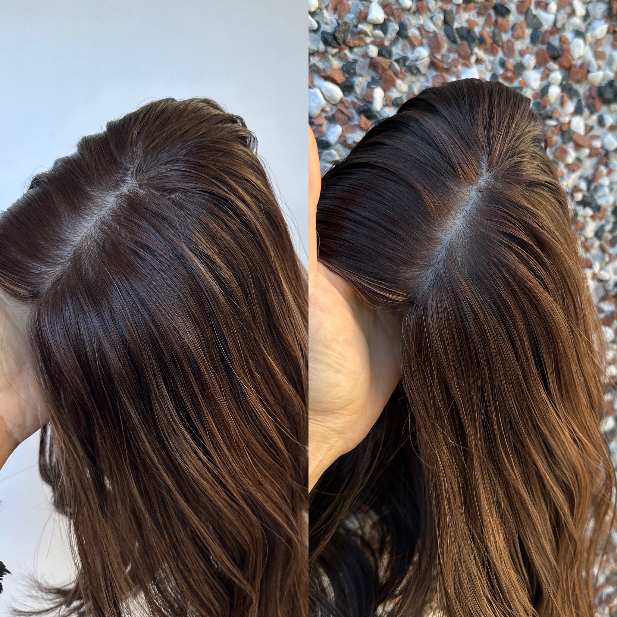 A Luxury Silk Hair Topper which blends beautifully with your own hair to hide hair loss and thinning. The end result is natural and undetectable.