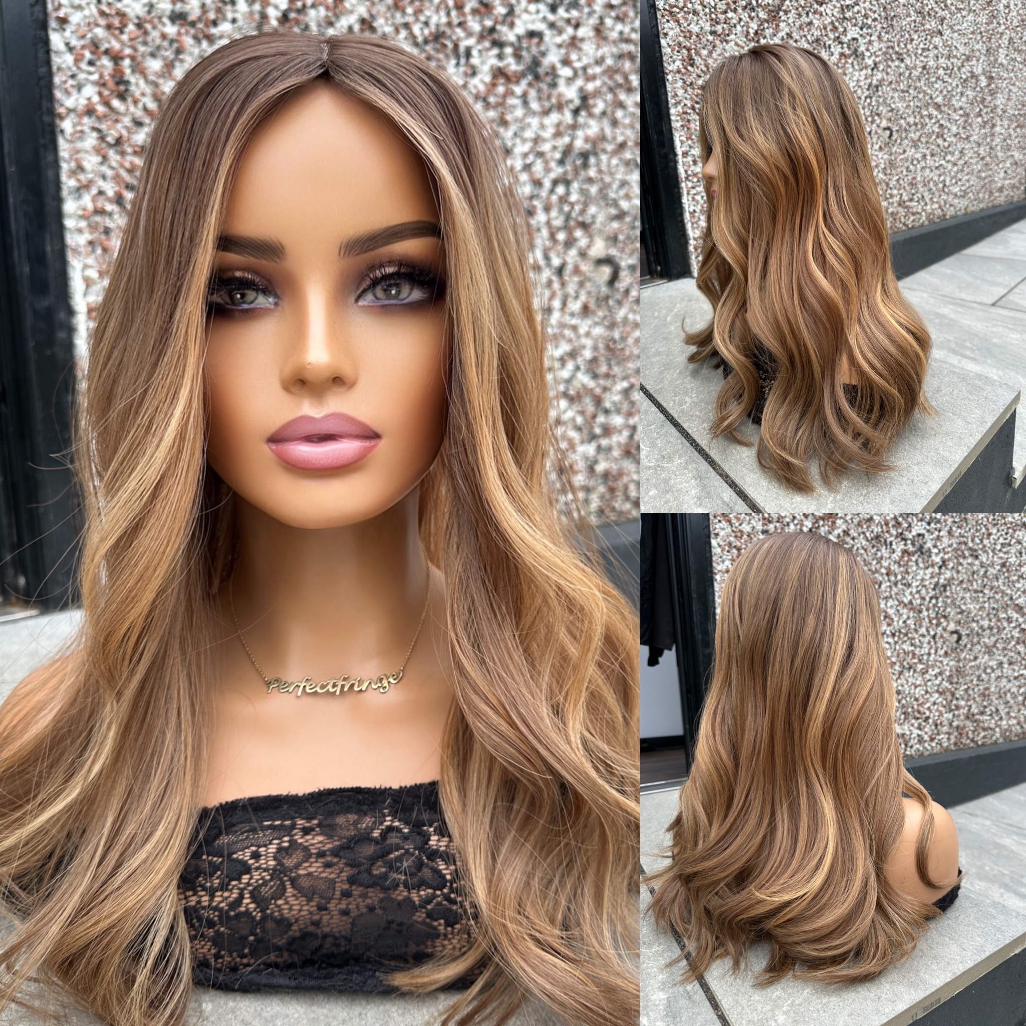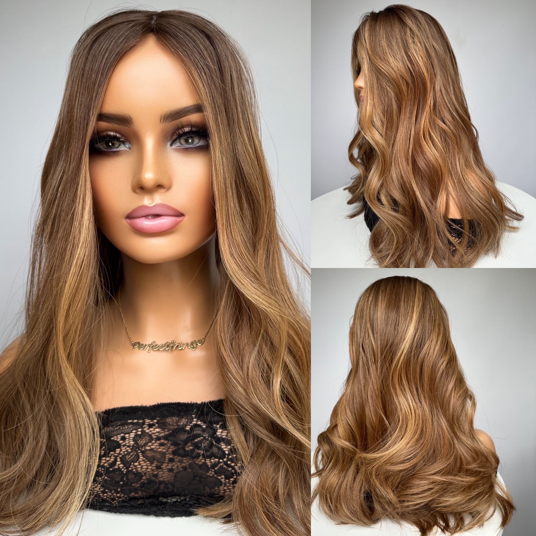 Mousey light brown with slightly darker root smudge, and golden caramel highlights, such a pretty sparkly shade
