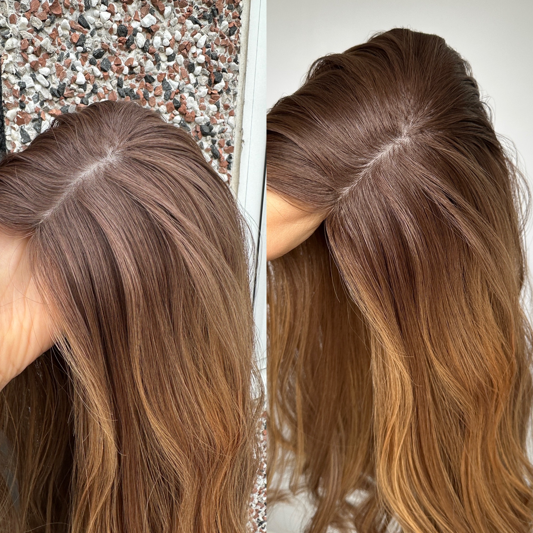 A Luxury Silk Hair Topper which blends beautifully with your own hair to hide hair loss and thinning. The end result is natural and undetectable.