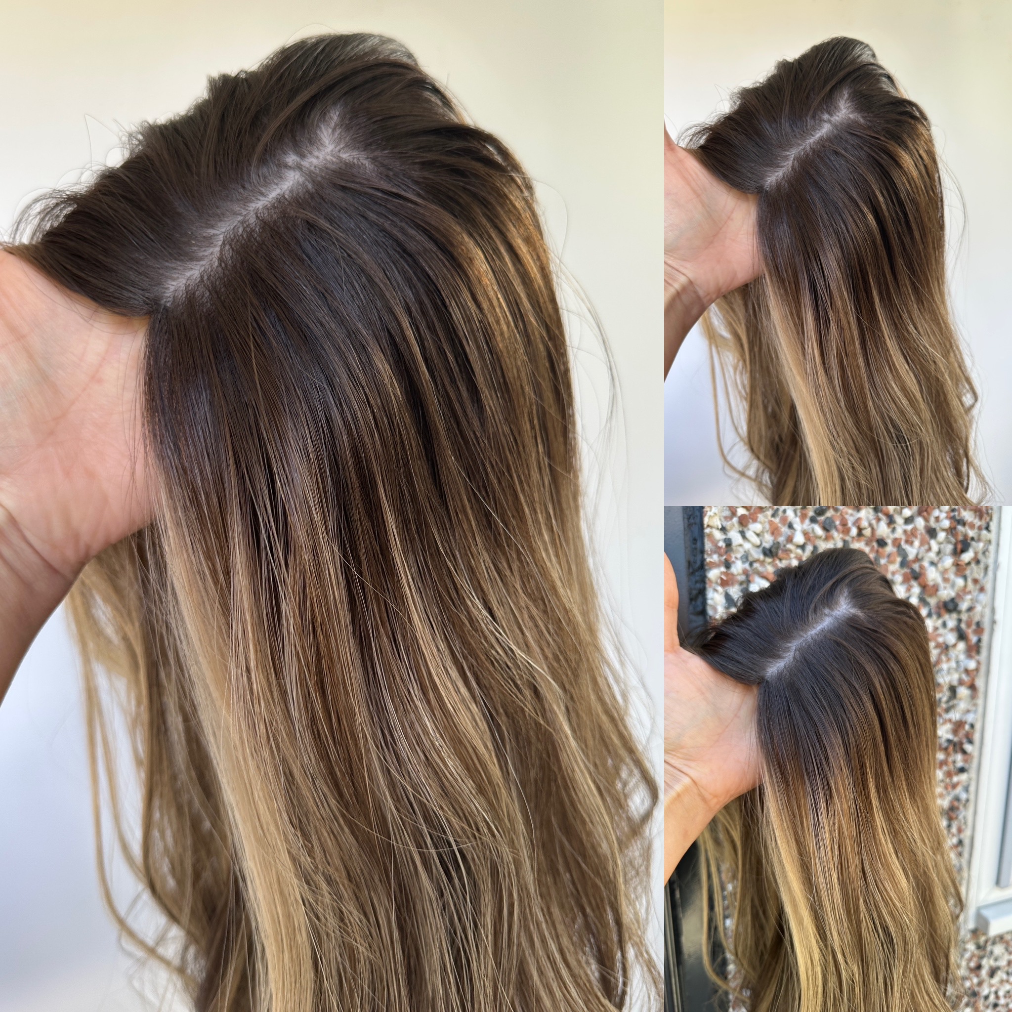 A Luxury Silk Hair Topper which blends beautifully with your own hair to hide hair loss and thinning. The end result is natural and undetectable.
