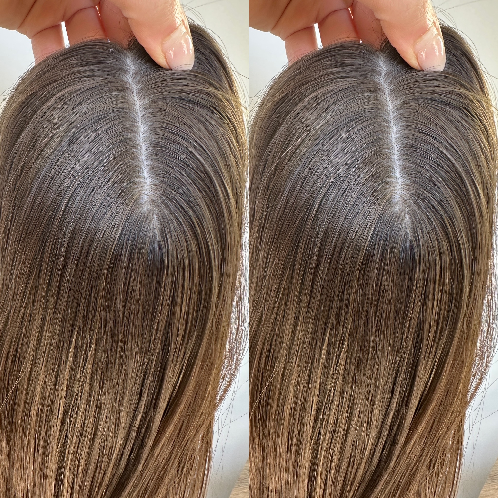 A Luxury Silk Hair Topper which blends beautifully with your own hair to hide hair loss and thinning.  The end result is natural and undetectable.