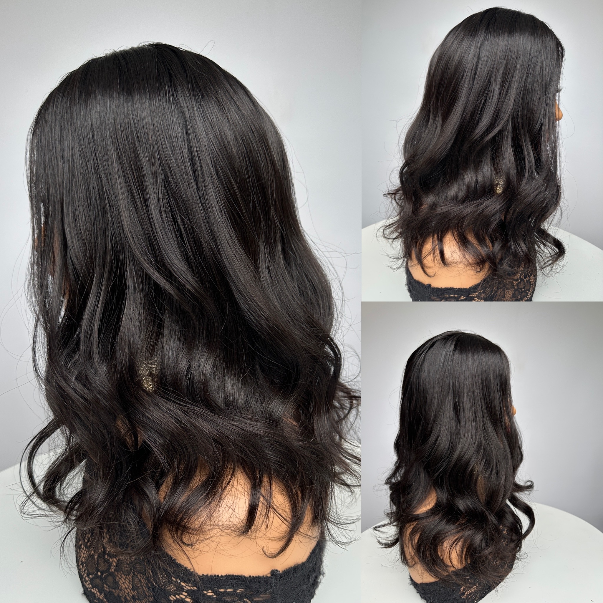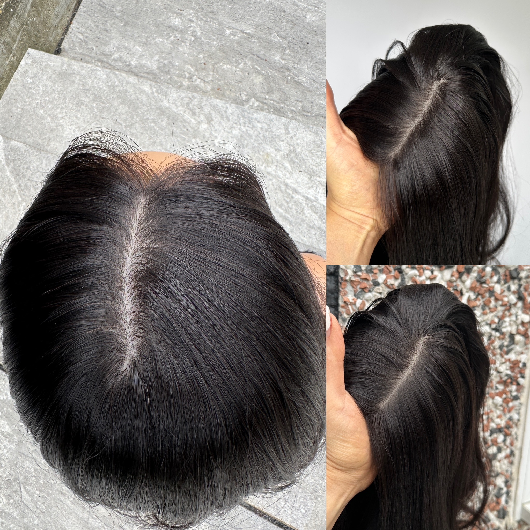 A Luxury Silk Hair Topper which blends beautifully with your own hair to hide hair loss and thinning.  The end result is natural and undetectable.