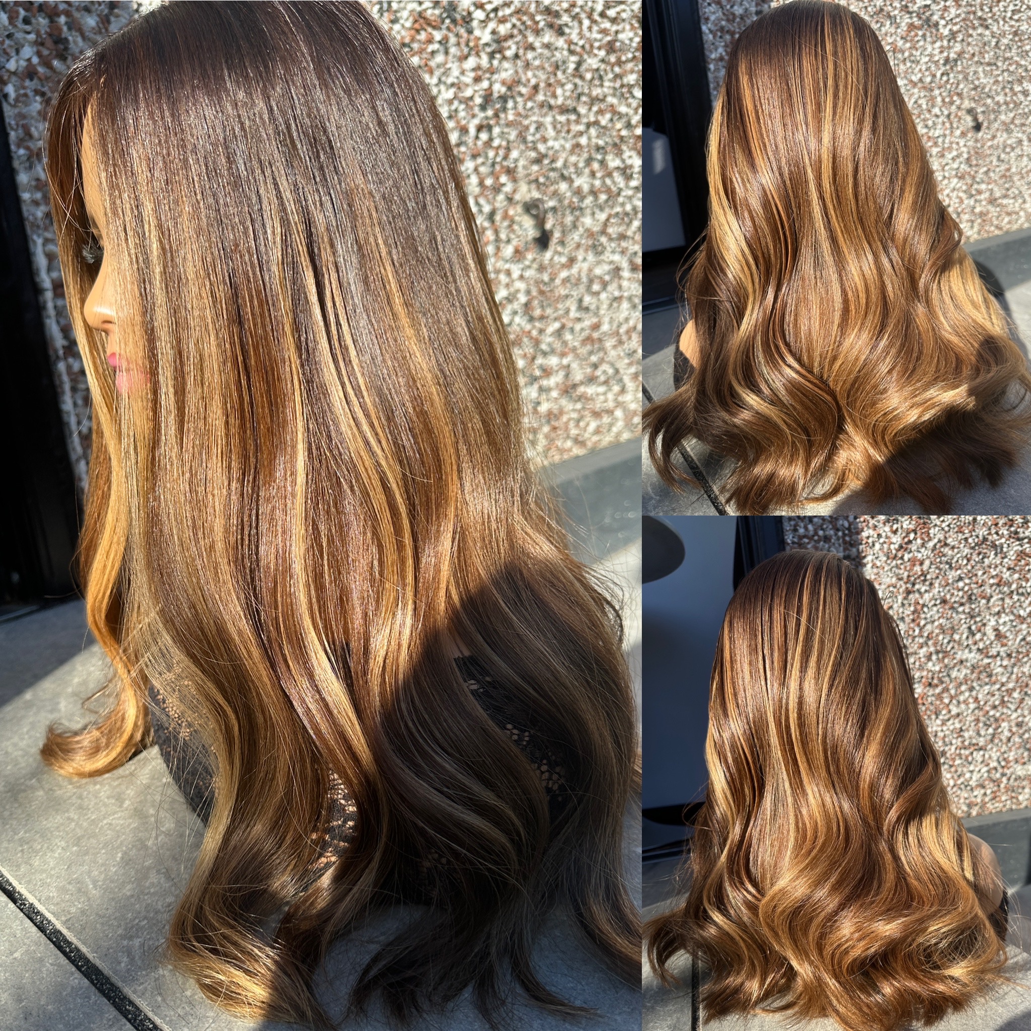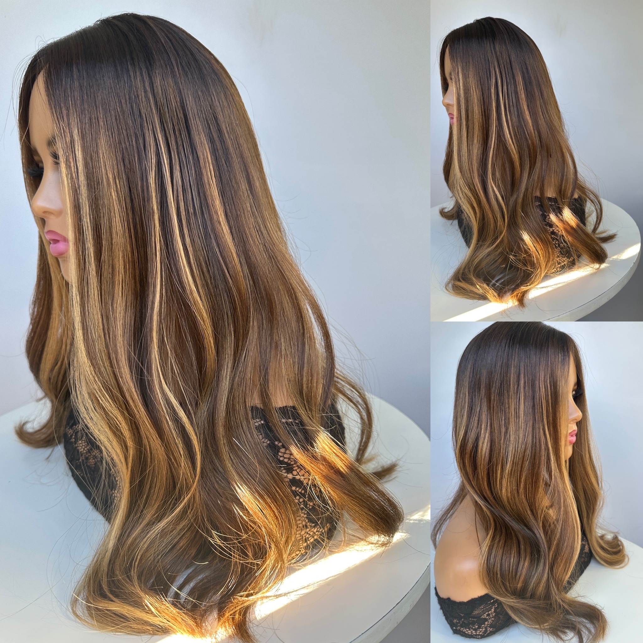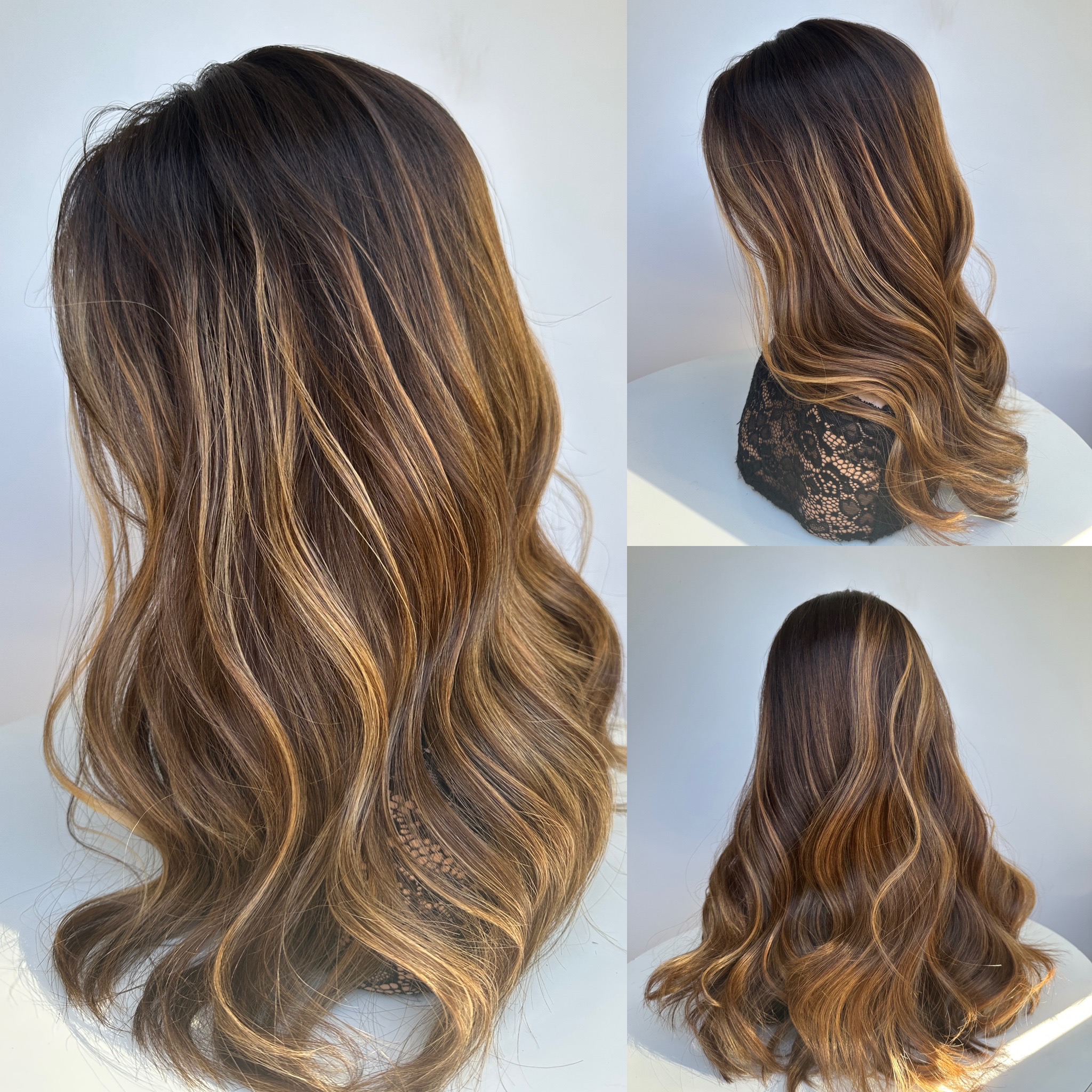 Super dimensional mix of caramels, browns, sweet golden blonde with level 5 dark brown root smudge for blending and contrast