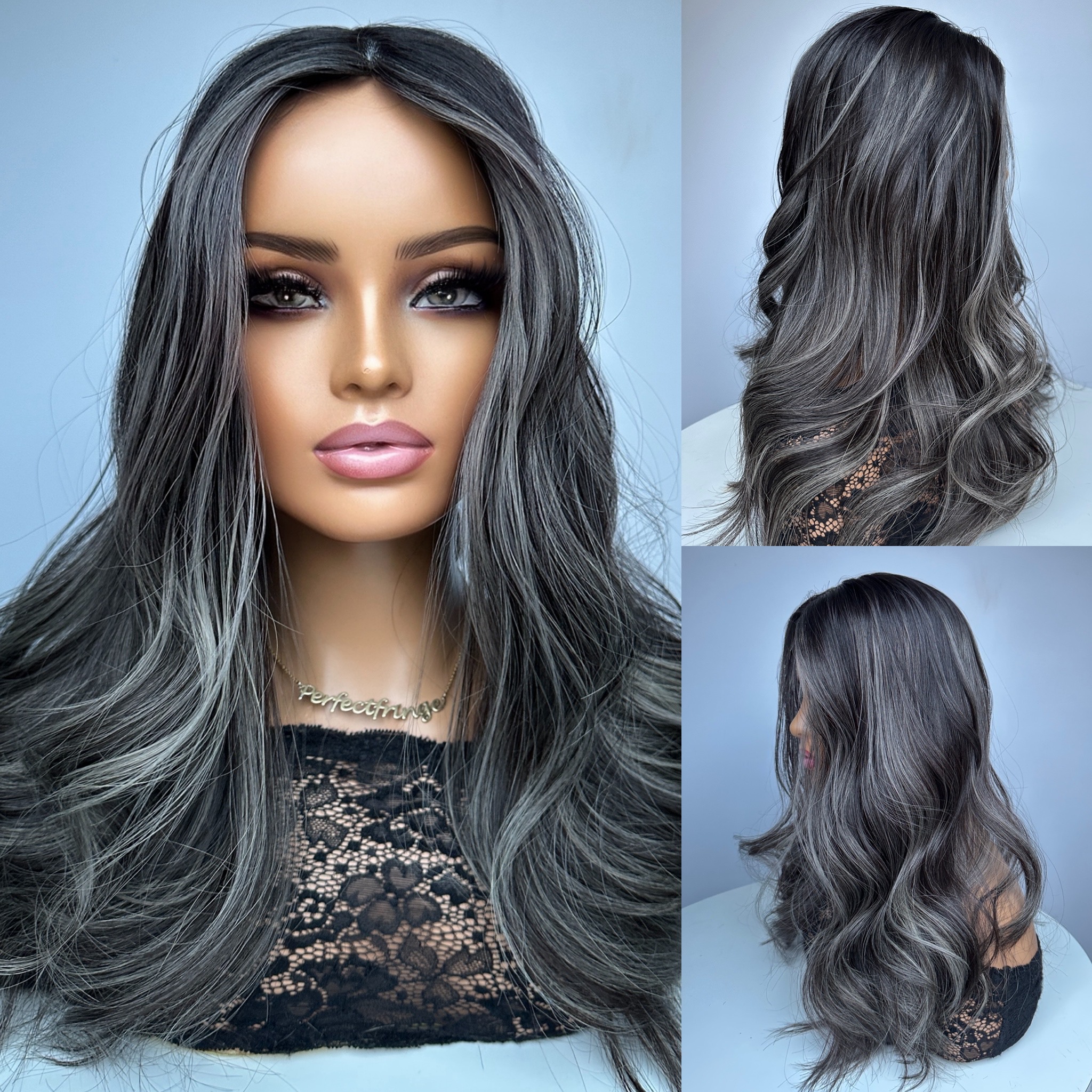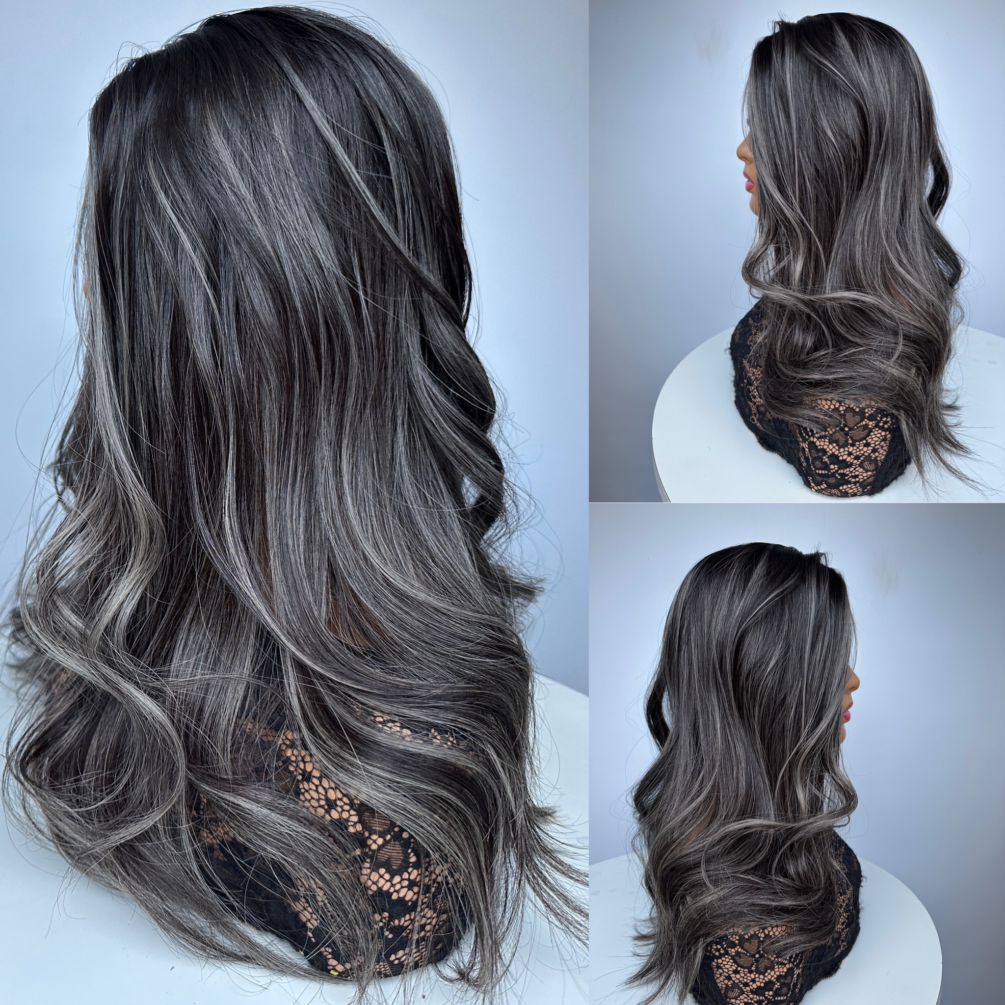 Virgin Dark/Darkest Brown with Glimmering Silver Highlights & Money Piece starting from the very top